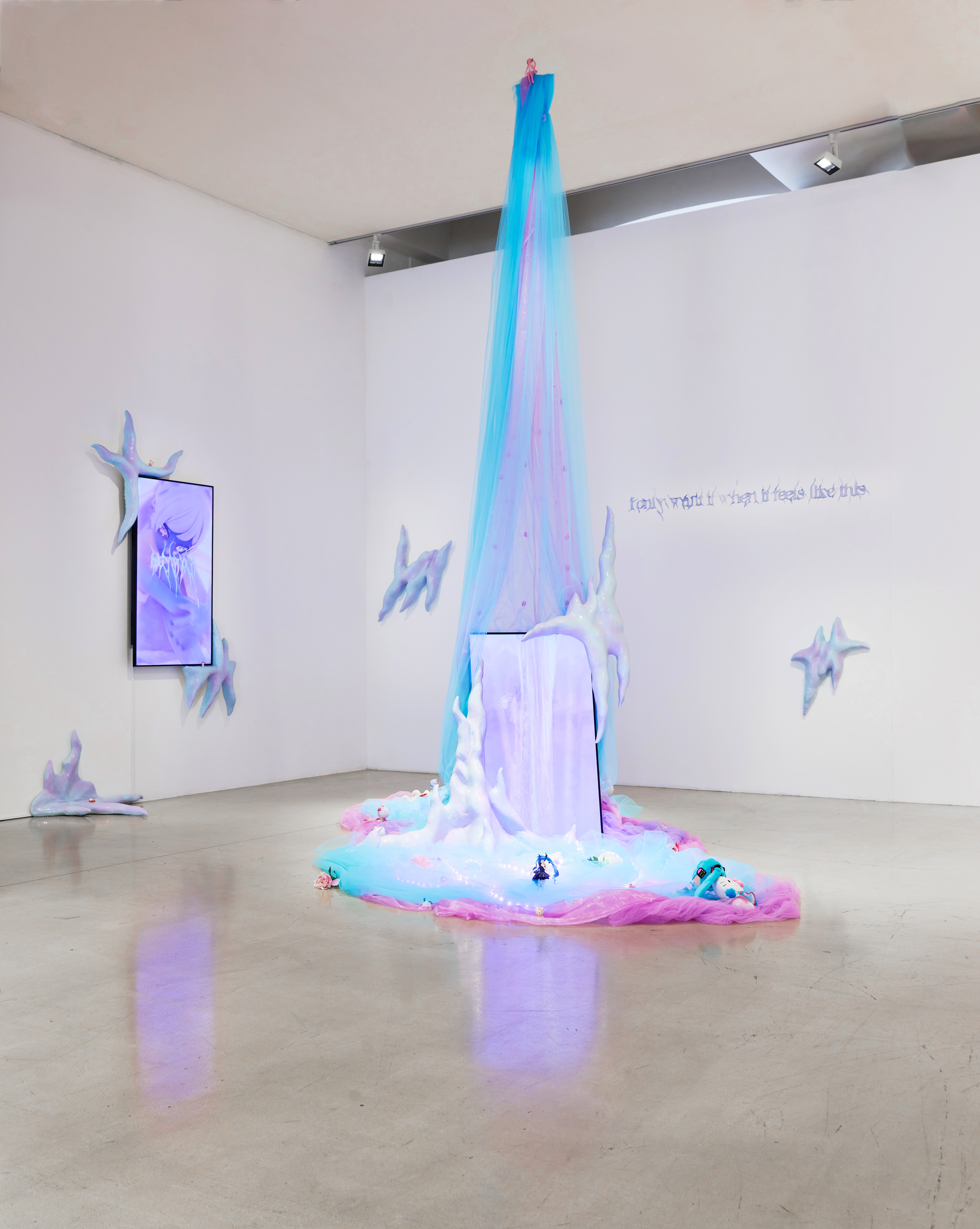 The installation conjures a speculative, lesbian-coded cyberscape—a place of fluid connection and queer longing, where touch transcends screens and matter drifts between states. It invites the viewer into a soft, utopian elsewhere, one that imagines technology not as barrier, but as a vessel for tenderness, dissolution, and becoming.