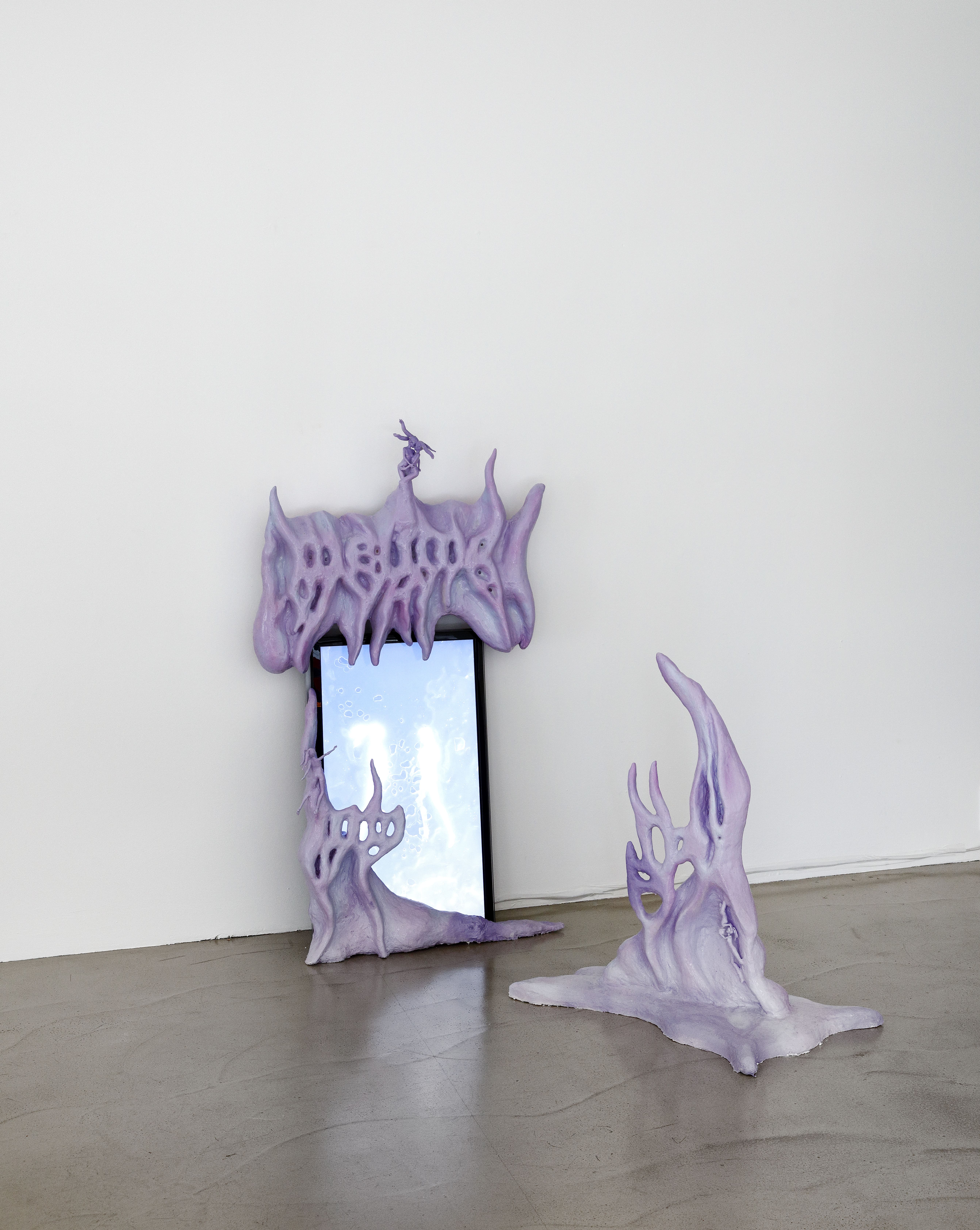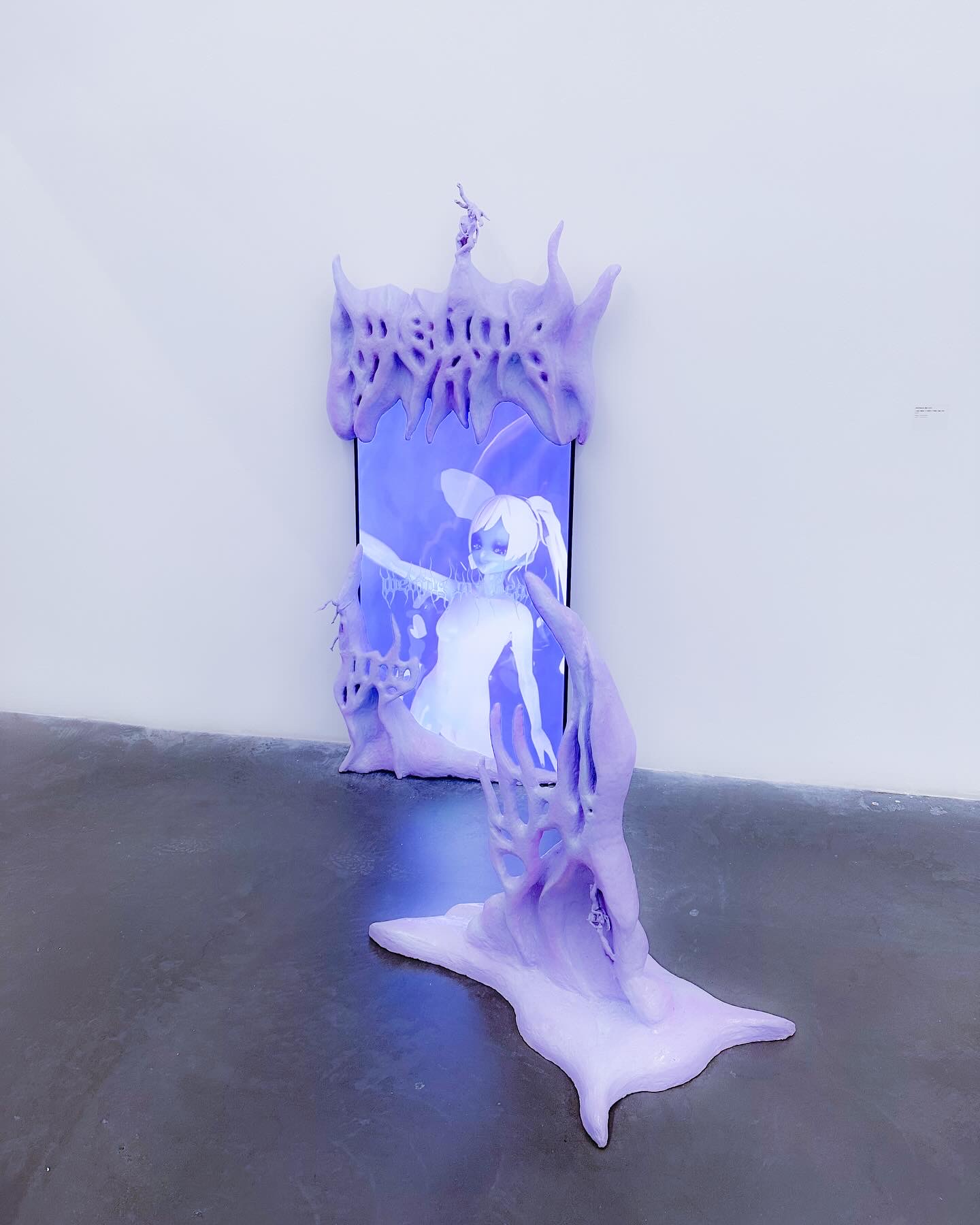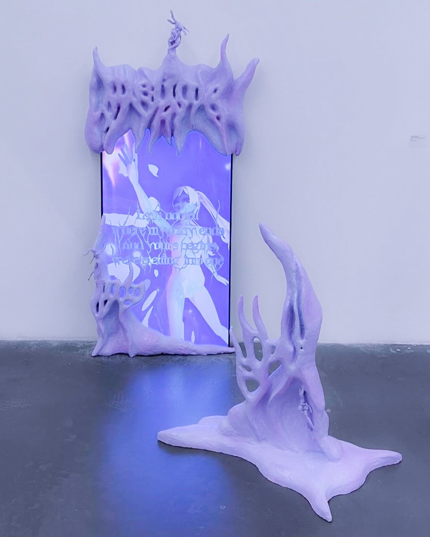 Working under the networked persona @cybervoid69, she mobilizes this cyclical process as a method of worldbuilding, integrating research, archiving, rendering, sculptural fabrication, and installation into a fluid praxis that collapses consumption and production, reception and transmission.