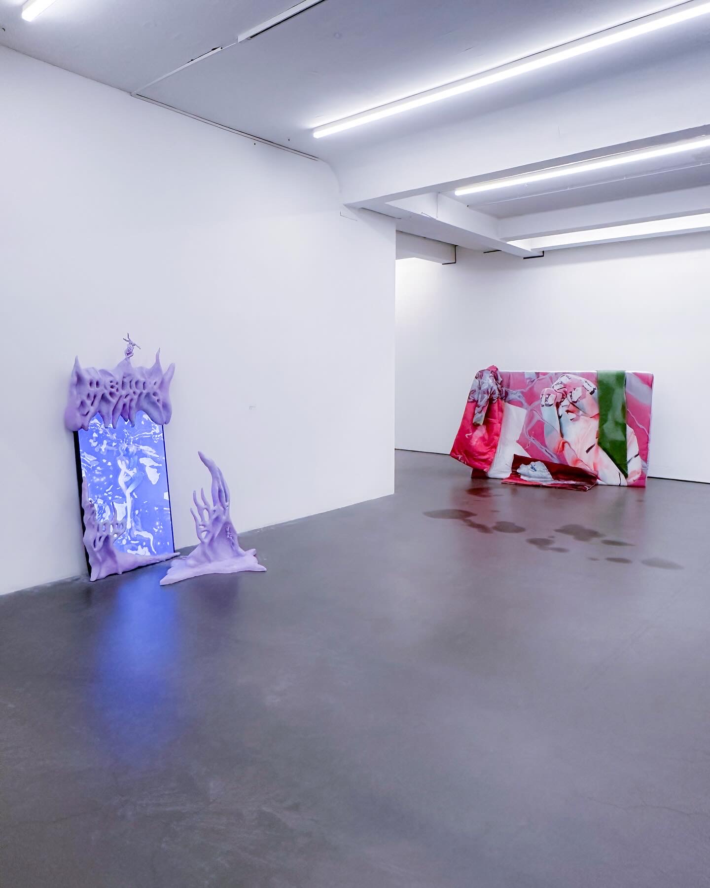 The installation conjures a speculative, lesbian-coded cyberscape—a place of fluid connection and queer longing, where touch transcends screens and matter drifts between states. It invites the viewer into a soft, utopian elsewhere, one that imagines technology not as barrier, but as a vessel for tenderness, dissolution, and becoming.