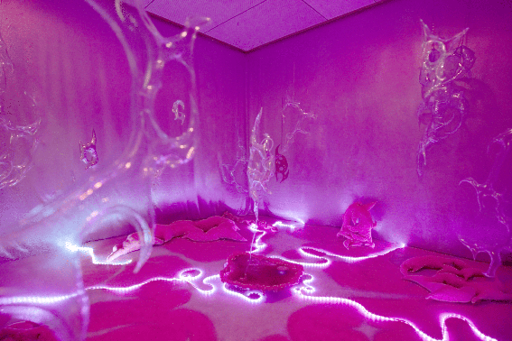 Based on the cyber-aesthetic of hyper-femme online spaces and their users, this immersive installation reflects the extravagant opulence of utopian visions of the future. A fountain as a sculptural focal point is surrounded by accompanying besties and bathed in luminous pink light, which is reflected in and scattered throughout the sculpture's iridescent material.
